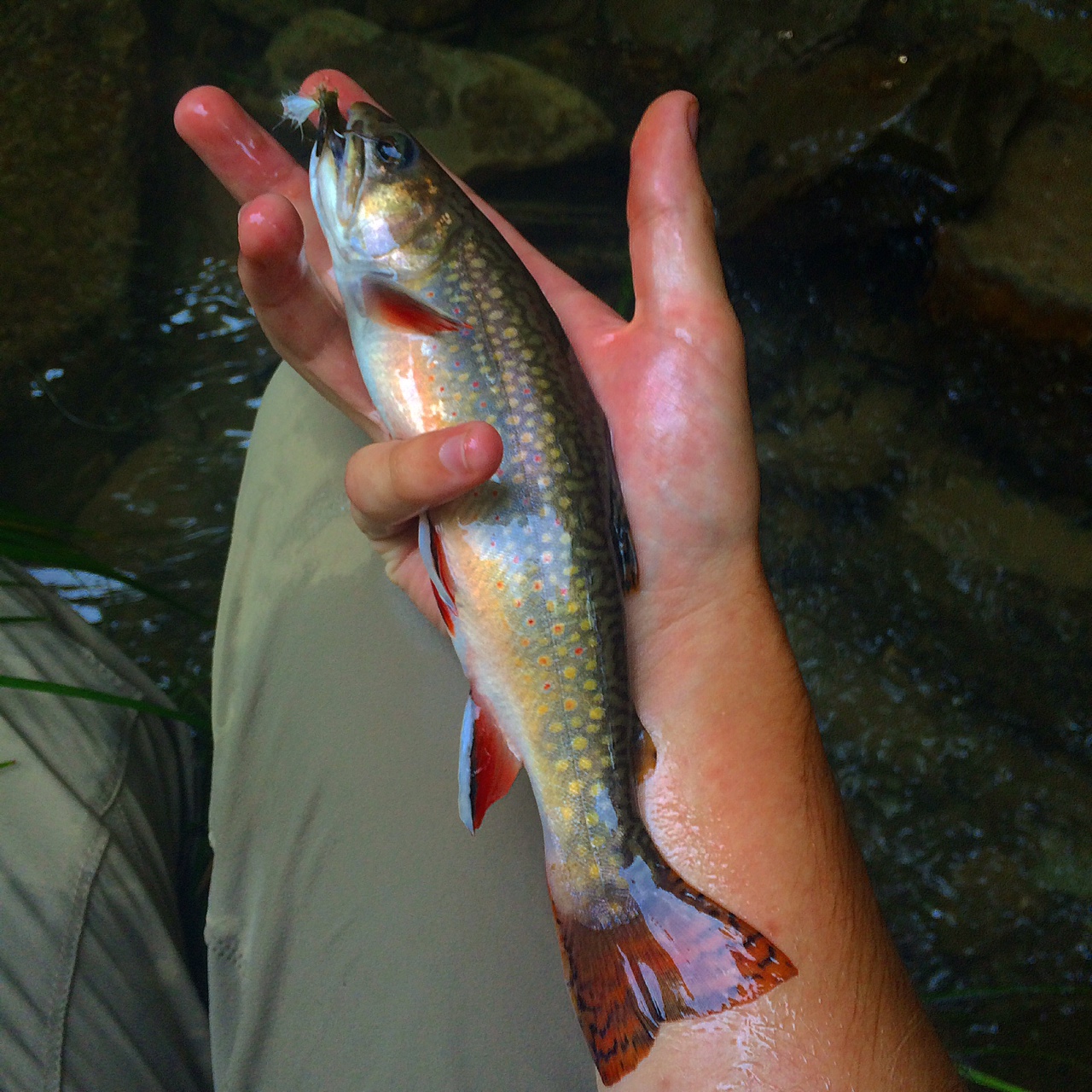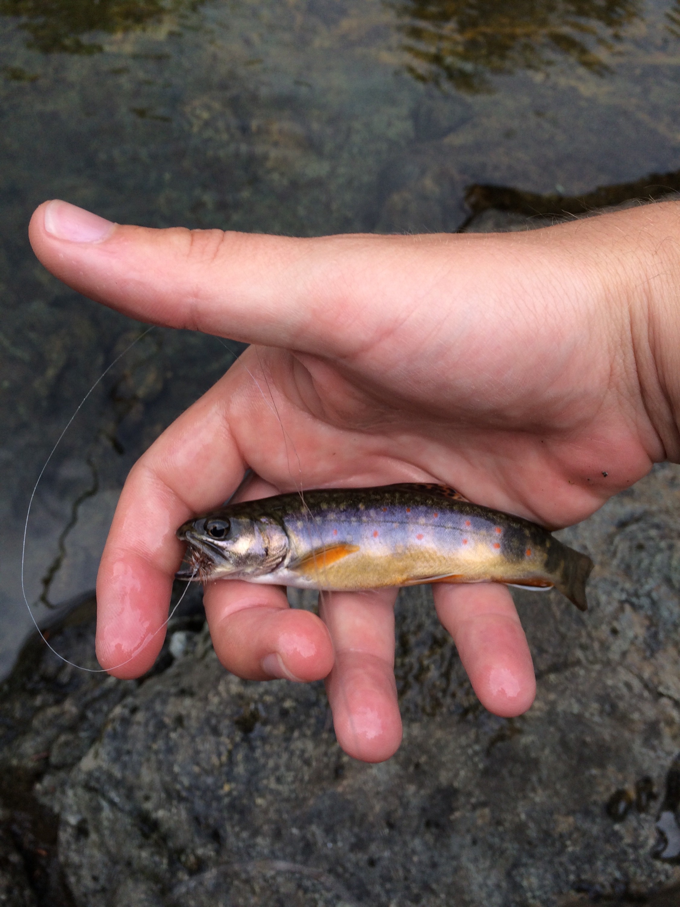 I found a nice pool where there had to be 10-15 Brookies lined up feeding on nymphs low in the water column. I tied on a size 14 Hares ear, with a little Sparrow dropper. I sent out my fly on a high stick dead drift, and connected with a little brook trout on the first pass through the pool. The patterns on these fish are breathtaking. I only wish there were more places to catch these fish close to me.